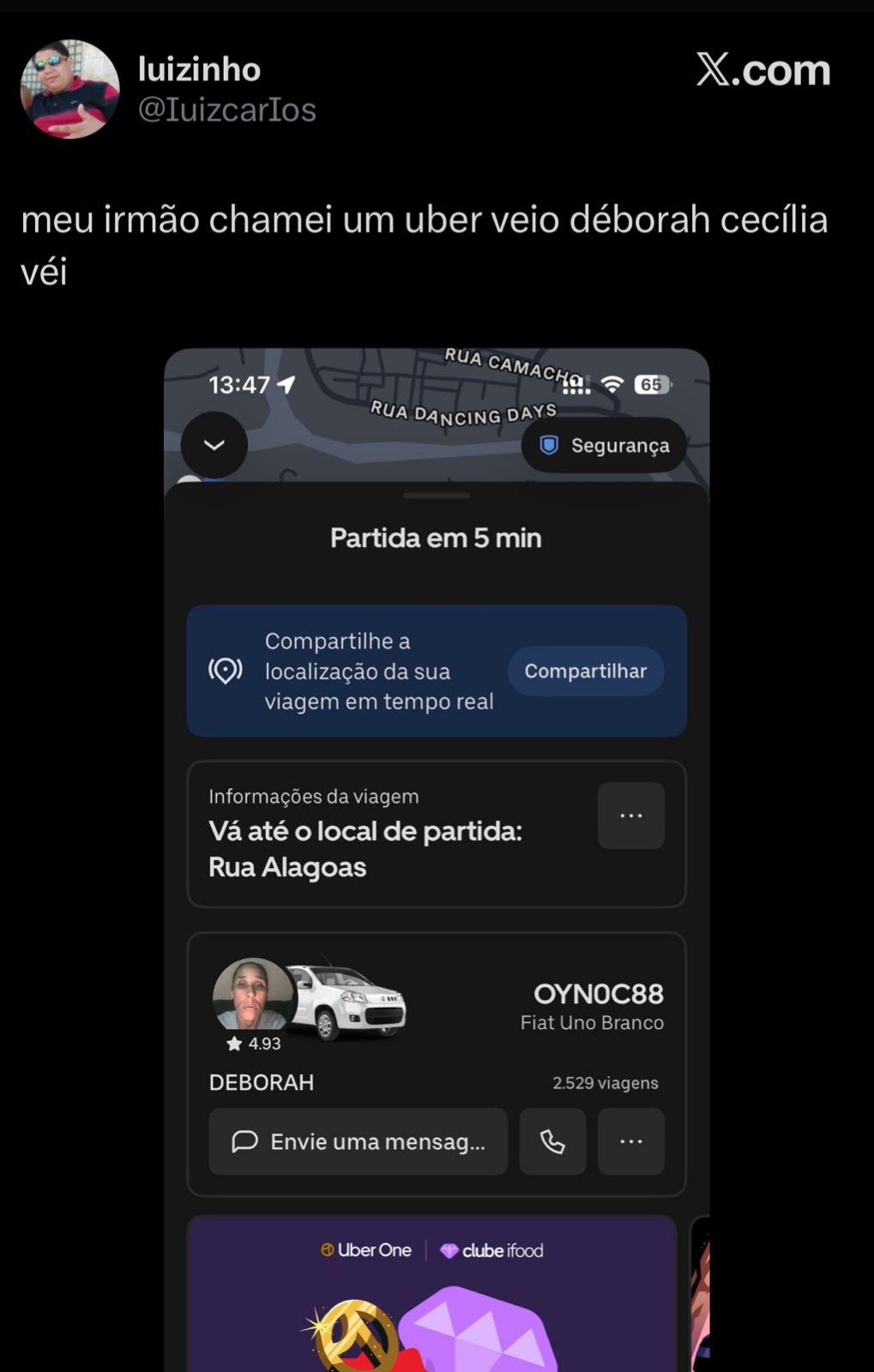 No X, antigo Twitter, uma conta publicou um print do aplicativo, em que mostra quem é o motorista a caminho. No post, Déborah aparece na direção de um Fiat Uno Branco. A mesma conta ainda disse nos comentários que sabia que a árbitra fazia corridas também de moto pelo Ipsep, bairro na zona Sul do Recife.