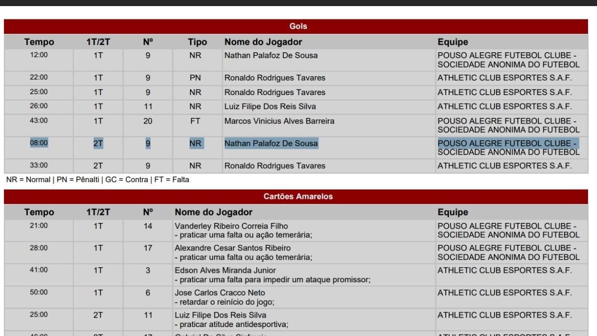 O equívoco ocorreu no documento da vitória do Athletic sobre o Pouso Alegre por 4 a 3, na última quarta-feira (21/1), no Manduzão. O juiz informou que Palafoz marcou dois gols: um aos 12 minutos do primeiro tempo e outro aos 8′ do segundo.