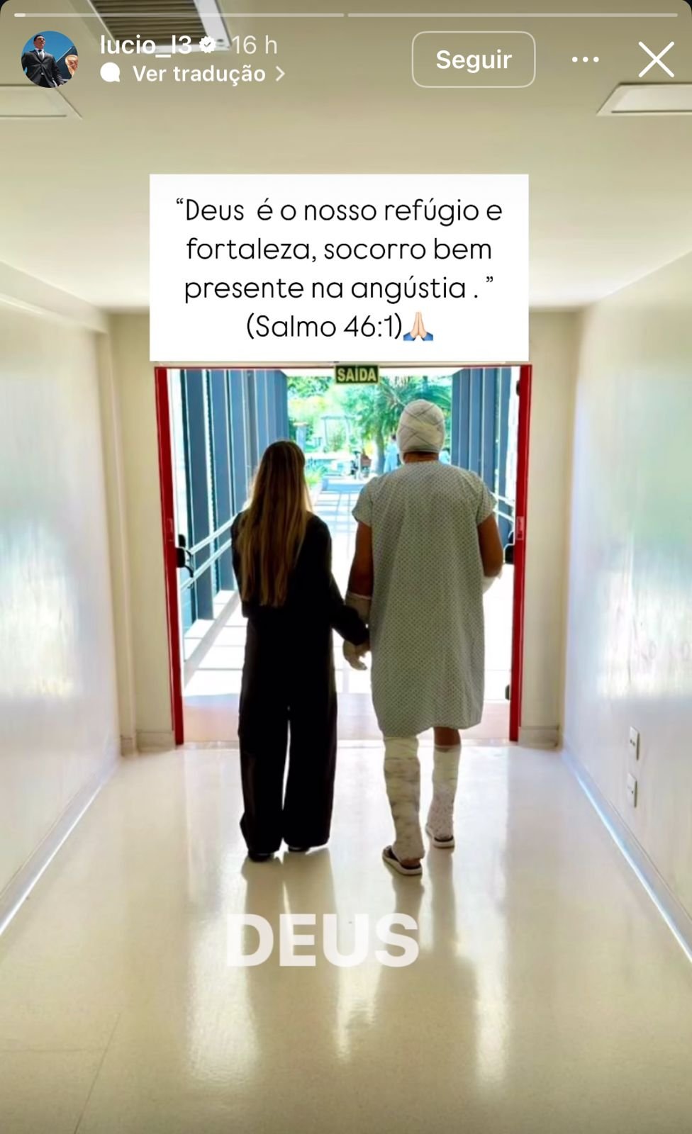 No Instagram, o perfil oficial do ex-zagueiro compartilhou foto andando ao lado da esposa, Marília Forgiarini, e com partes do corpo enfaixado, incluindo a cabeça. Na legenda, uma mensagem bíblica: “Deus é nosso refúgio e fortaleza, socorro bem presente na angústia”.