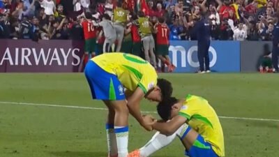 Fim do sonho! A Seleção Brasileira perdeu para Portugal nos pênaltis (6 a 5), nesta segunda-feira (24/11), na Aspire Zone (Campo 7), em Doha, no Catar, e caiu na semifinal da Copa do Mundo Sub-17. O tempo regulamentar terminou empatado sem gols. Nas penalidades, o Brasil teve a chance de se classificar na quinta cobrança, mas falhou. Nas alternadas, Portugal saiu na frente, e Angelo cobrou mal para a Amarelinha.