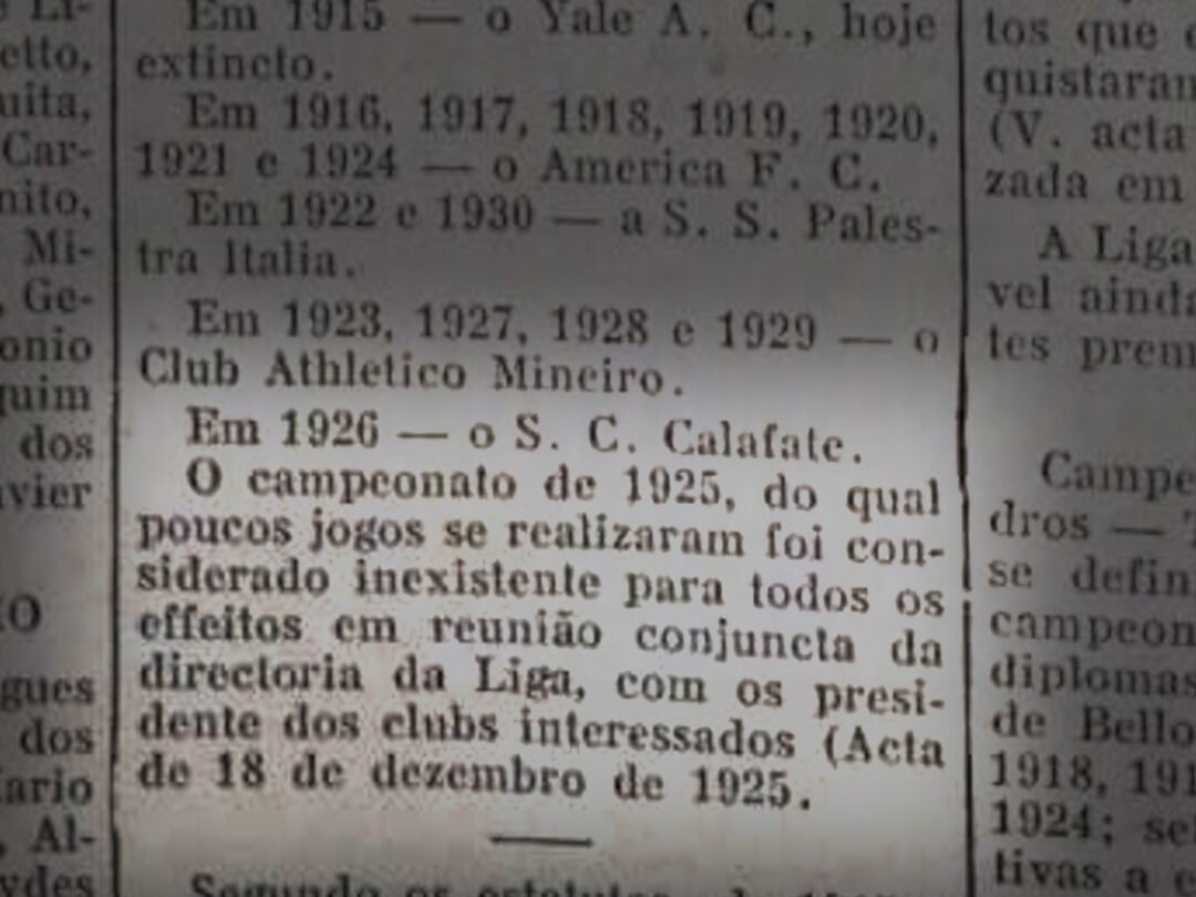 Uma reportagem publicada pelo jornal Estado de Minas em 16 de janeiro de 1931 chegou a noticiar que o campeonato de 1925 fora considerado inexistente em reunião oficial da Liga com os clubes.