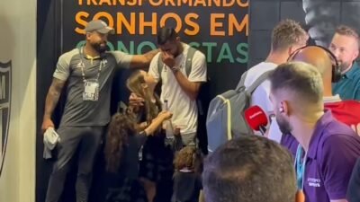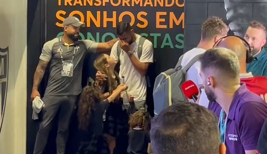 O atacante Alan Kardec, do Atlético, se emocionou ao passar pela zona mista da Arena MRV, neste domingo (10/11), depois da final da Copa do Brasil. Ele estava ao lado das filhas e foi consolado por um segurança do clube.