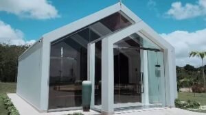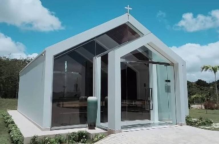 A pequena igreja tem estilo neoclássico, com portas de vidro e painel de madeira. “Uma capela cercada pela natureza. Um espaço especial para celebrar a fé desta família querida”, postou a arquiteta Mariana Maran.