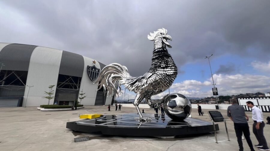 “Fred me procurou em 2021 para alguma parceria com a arena. A ideia inicial era colocar inox nas barras de guarda-corpos, mas não foi possível, pois já tínhamos encomendado. Aí pensei em uma escultura, mandei duas imagens, uma do Tottenham e um do Atlanta Falcons, uma águia que fica no meio da esplanada do estádio do Atlanta. Após quatro anos, está realizado o projeto. Um galo inox maravilhoso”, comemorou o CEO do Atlético.