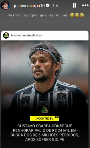 O meio-campista Gustavo Scarpa, do Atlético, segue travando batalha judicial contra o atacante Willian “Bigode”, do América, e a empresa Xland, por golpe envolvendo criptomoedas que o fez perder mais de R$ 6 milhões. Na última semana, em meio ao processo, o jogador do Galo conseguiu penhora de um Fiat Palio avaliado em R$ 24 mil. Nesta sexta-feira (16/5), o atleta brincou sobre a situação em rede social.