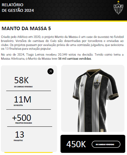 Na última sexta-feira (16/5), o balanço financeiro disponibilizado pelo Atlético trouxe à tona diversos números relacionados à administração do clube-empresa no ano de 2024 – até mesmo no aspecto comercial. Quanto o Galo arrecadou com o Manto da Massa 5, por exemplo? Esta foi uma das perguntas respondidas pelo documento.