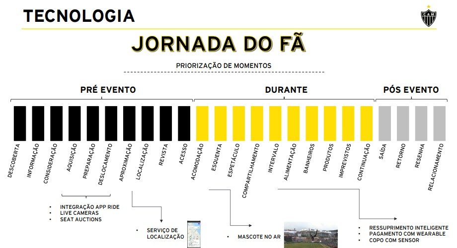 A partir do implemento da tecnologia e do benchmarking, o Atlético busca oferecer uma jornada mais completa possível. Para isso, o clube pensa em artifícios para melhorar o máximo a experiência, desde o momento de compra do ingresso até a saída do estádio ao fim do jogo.