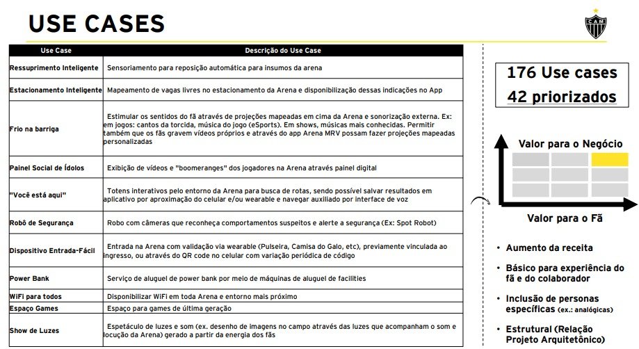 Os diretores do Galo também afirmam que são 176 cases pensados, sendo 42 com prioridades. Entre eles, há o mapeamento de vagas livres no estacionamento da Arena e disponibilização dessas indicações no App e o espetáculo de luzes e som gerado a partir da energia dos fãs.
