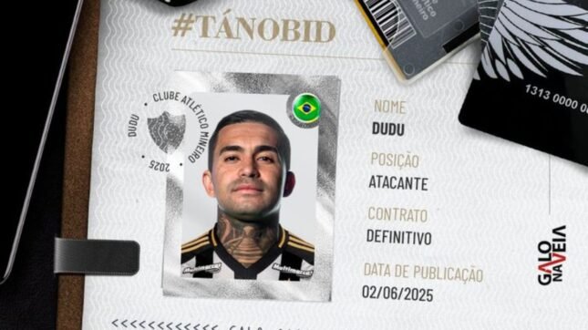 O Atlético informou que o atacante Dudu foi inscrito, nesta segunda-feira (2/6), no Boletim Informativo Diário (BID) da CBF. Com isso, o jogador de 33 anos tem condições de jogo e deve reforçar o Galo na partida contra o Internacional, na Arena MRV, em Belo Horizonte, a partir das 21h30 do dia 12 de junho (uma quinta-feira), pelo Campeonato Brasileiro.