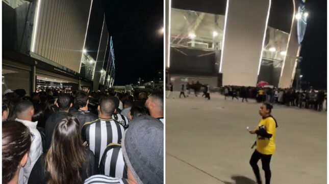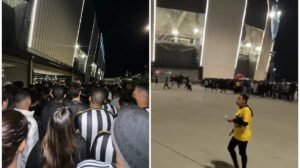 “Olha o que acontece. O jogo já começou. Eu tentei entrar, deu até BO, ‘ah, entra antes’. Eu já estava na fila há 30 minutos. Eu falei: ‘O que? Preciso ir ao banheiro’. Olha isso, o tempo que os caras estão aí”, relatou uma pessoa, em vídeo publicado no X (antigo Twitter).