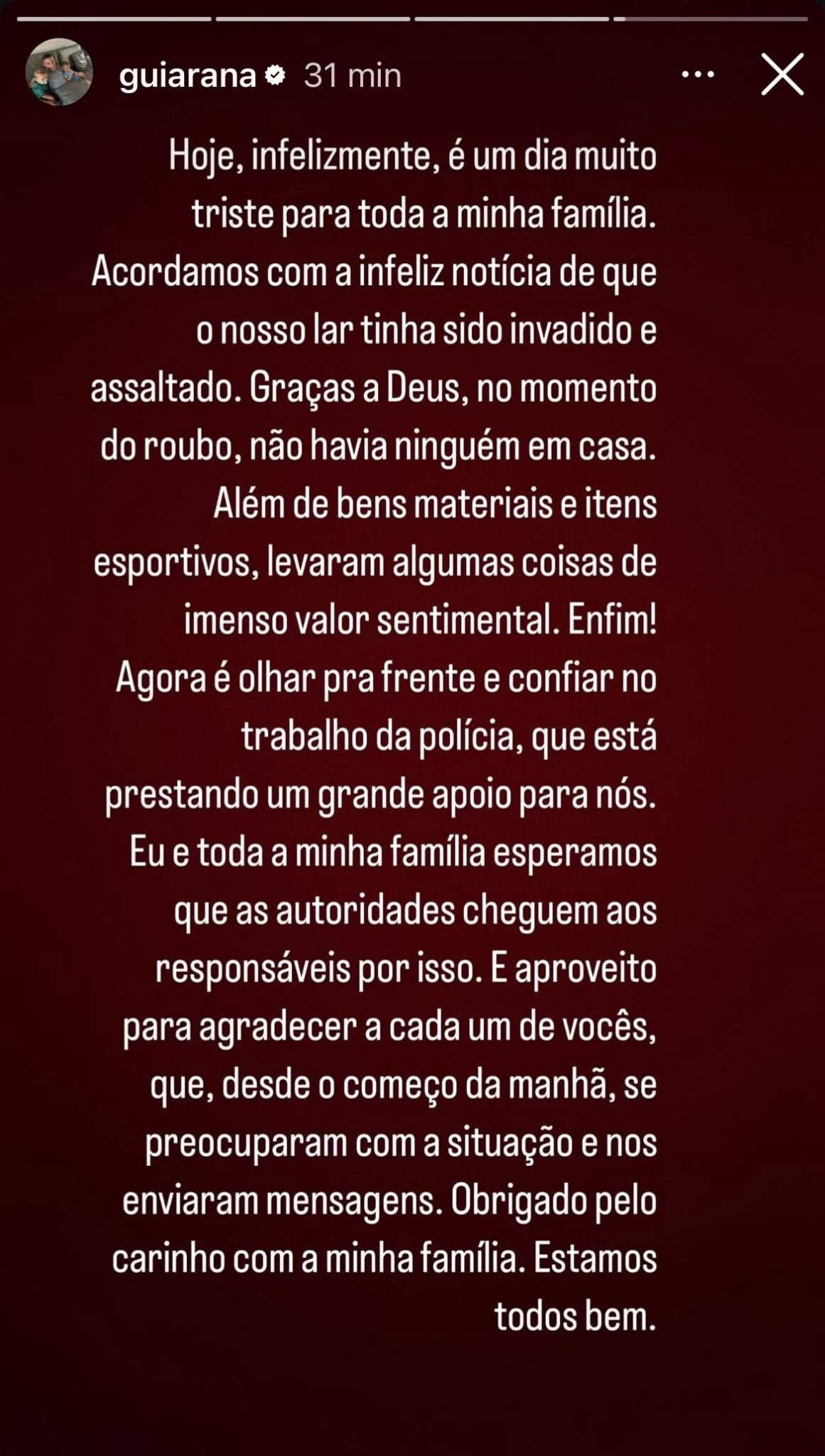 “Hoje, infelizmente, é um dia muito triste para toda a minha família. Acordamos com a infeliz notícia de que o nosso lar tinha sido invadido e assaltado. Graças a Deus, no momento do roubo, não havia ninguém em casa. Além de bens materiais e itens esportivos, levaram algumas coisas de imenso valor sentimental”, iniciou Arana.