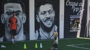 Com camisa personalizada do pai, o garoto realizou o primeiro treino na quadra, que é repleta de grafitis com os rostos de alguns dos maiores ídolos do Atlético.