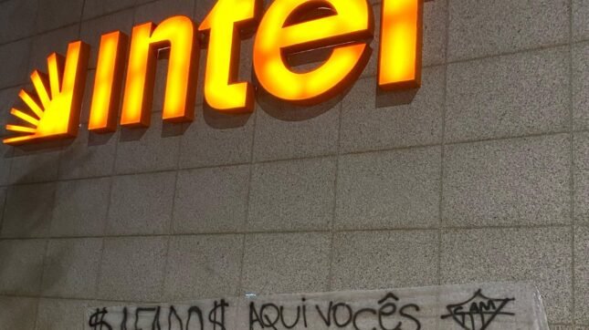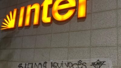“$AFADO$. Aqui vocês pagam salários??”, interroga a faixa erguida na sede do Banco Inter.