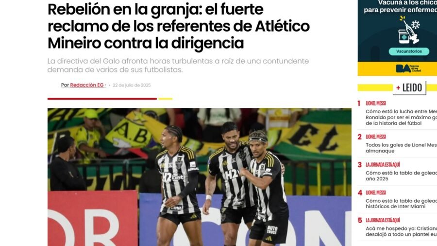 A revista El Gráfico, da Argentina, repercutiu a crise financeira do Atlético e seus desdobramentos extracampo. A situação escalou a ponto de alguns jogadores – Igor Gomes, Gustavo Scarpa e Guilherme Arana – acionarem o Galo extrajudicialmente. O atacante Rony chegou a pedir rescisão, mas desistiu da ideia.
