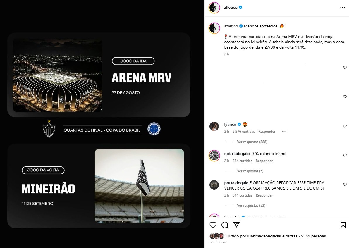 O Atlético enfrentará o Cruzeiro na Arena MRV na semana de 27 de agosto. Já o duelo de volta será na semana de 11 de setembro, no Mineirão.