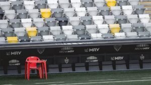 Às 21h05, mais uma brincadeira do Atlético. O clube publicou uma foto de uma cadeira e uma mesa vermelha de plástico – típicas de bares e botecos – posicionadas em frente ao banco de reservas da Arena MRV.