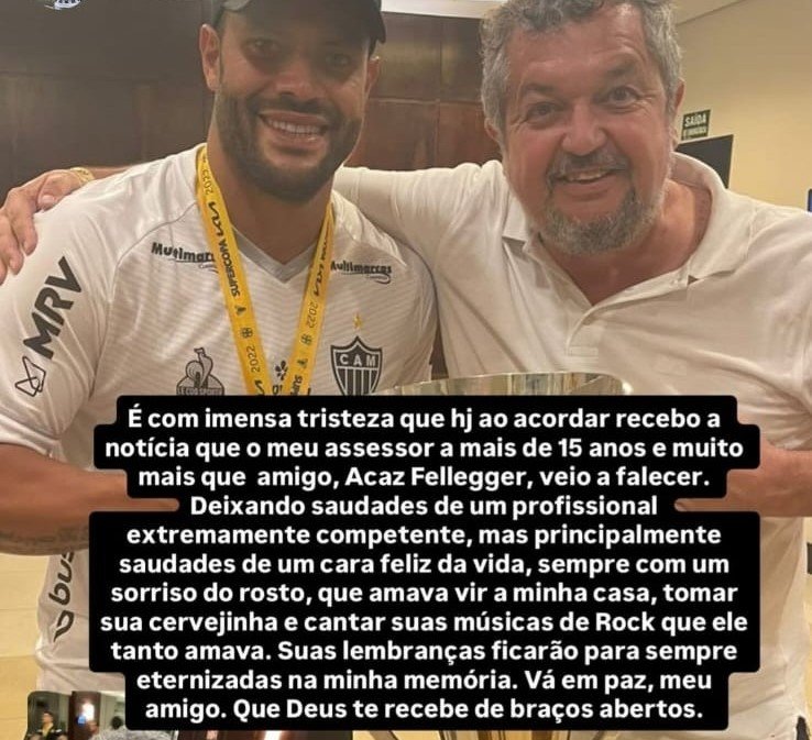 “É com imensa tristeza que hoje ao acordar recebi a notícia que o meu assessor há mais de 15 anos e muito mais que amigo, Acaz Fellegger, veio a falecer”, iniciou o camisa 7 do Galo.