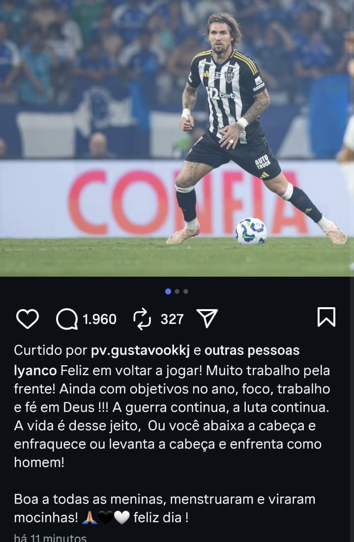 “Feliz em voltar a jogar! Muito trabalho pela frente! Ainda com objetivos no ano, foco, trabalho e fé em Deus !!! A guerra continua, a luta continua. A vida é desse jeito, Ou você abaixa a cabeça e enfraquece ou levanta a cabeça e enfrenta como homem! Boa a todas as meninas, menstruaram e viraram mocinhas! 🙏🏼🖤🤍 feliz dia”, escreveu.