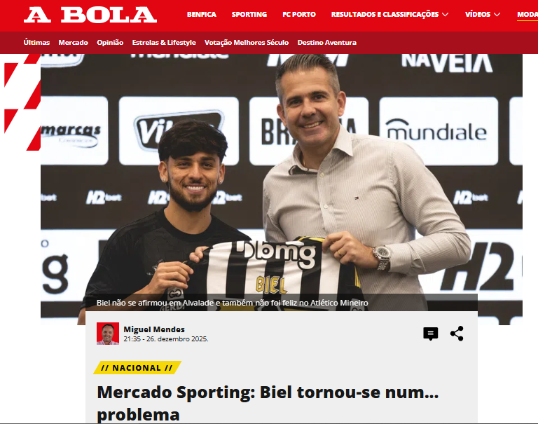 Biel está cedido ao Atlético por empréstimo até 30 de junho de 2026, mas está fora dos planos do Galo, segundo A Bola. “Atlético Mineiro pretende libertar-se do extremo, Sporting procura uma outra colocação no mercado, mas caso não tenha mercado pode ter mesmo de ficar no Brasil no próximo ano”, destaca o diário.