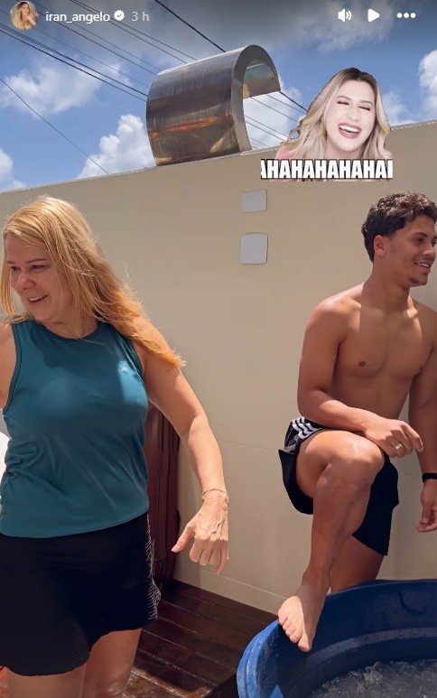 As imagens, publicadas nos stories do Instagram de Iran, mostram o jovem atleta se preparando para entrar na água gelada para cumprir a aposta. A cena foi gravada em clima de descontração durante uma reunião com amigos da família.