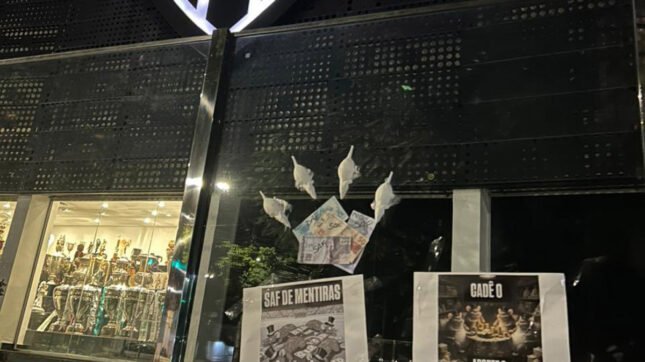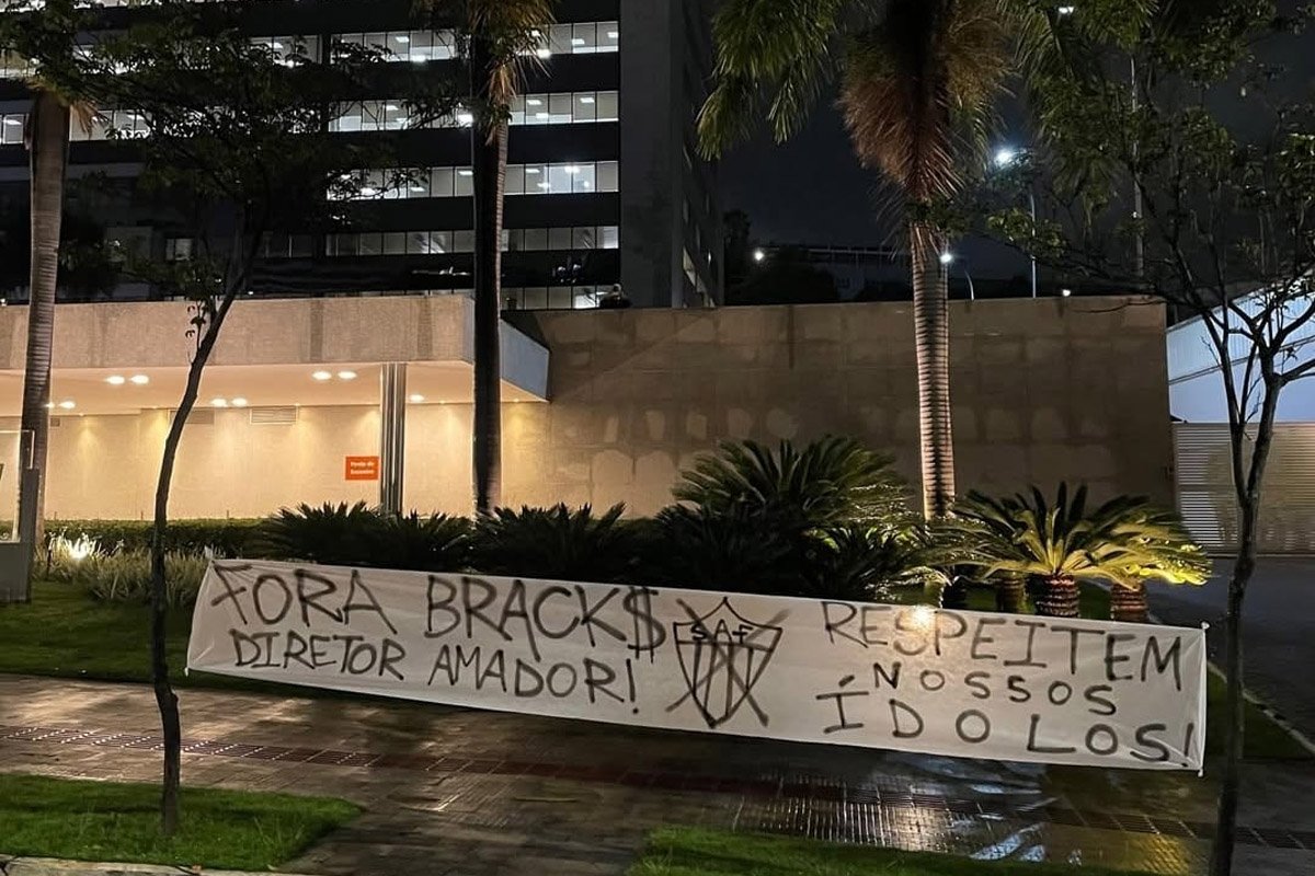 Faixas também foram estendidas em frente a empresas de Rubens Menin, principal acionista da SAF do Atlético, na capital mineiro. Paulo Bracks, chefe do futebol do Galo, foi o alvo nominal da manifestação.
