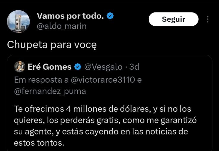 Em resposta, Aldo Marin disse: “chupeta para você”.