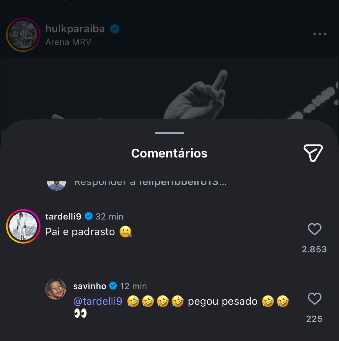Tardelli comentou em uma postagem de Hulk no Instagram: “Ídolo e padrasto”. No futebol, padrasto é uma gíria para dizer que algum jogador domina o adversário.