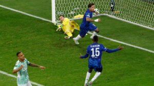 Empurrado pela torcida, o Real Betis deu o “cartão de visita” rapidamente na decisão. Aos 8 do tempo inicial, Malo Gusto errou o passe na defesa, e Isco mostrou a qualidade para dar assistência. Na esquerda, Abde Ezzalzouli recebeu, bateu cruzado e abriu o placar para a equipe espanhola: 1 a 0.