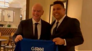Presidente da Fifa, Gianni Infantino foi presenteado por Ronaldo Fenômeno com uma camisa personalizada do Cruzeiro