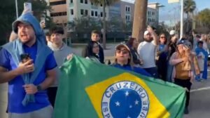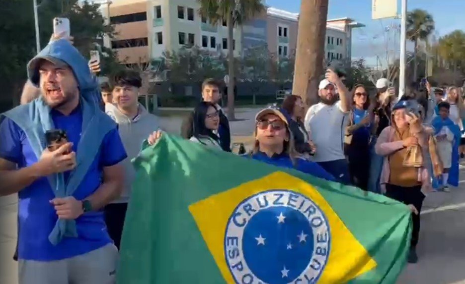 Cruzeirenses que estão em Orlando, na Flórida, levaram um bandeirão e cantaram o hino em uníssono na entrada do local onde o time celeste realiza as atividades do dia.