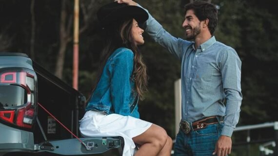 Na imagem, Lucas Silva aparece com trajes à moda “cowboy” – bota marrom, calça jeans, cinto com fivela country e camisa xadrez. Ele coloca um chapéu preto sobre o cabelo de Bianca, que usa um vestido branco, casaco jeans e bota de cano médio.