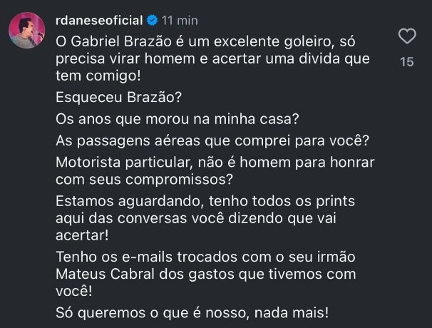 “Gabriel Brazão é um excelente goleiro, só precisa virar homem e acertar uma dívida que tem comigo! Esqueceu, Brazão? Os anos que morou na minha casa? As passagens aéreas que comprei para você? Motorista particular… Não é homem para honrar com seus compromissos?”, questionou Danese.