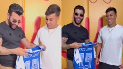 O atacante Kaio Jorge presentou o cantor sertanejo Gusttavo Lima com uma camisa do Cruzeiro nesta segunda-feira (23/6). Torcedor declarado do clube celeste, o artista exaltou o camisa 19, a quem chamou de ‘ídolo’ e ‘craque’. A interação foi compartilhada em story no Instagram do atleta.