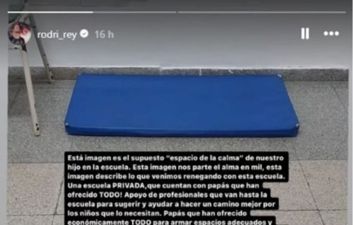 “Esta imagem é o suposto ‘espaço de calma’ do nosso filho na escola. Esta imagem descreve o que viemos enfrentando com essa escola. Esta imagem parte a nossa alma em mil. Uma escola particular, que conta com pais que ofereceram de tudo”, publicou Rey em seus stories do Instagram.