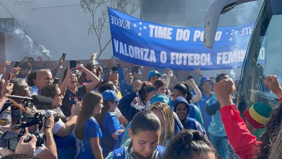 Jogadoras do Cruzeiro descem do ônibus e se juntam à torcida em festa antes de jogo decisivo