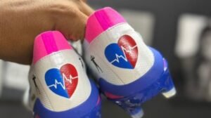 A chuteira era predominantemente branca, com detalhes em azul e rosa, e também trazia os nomes de familiares do jogador.