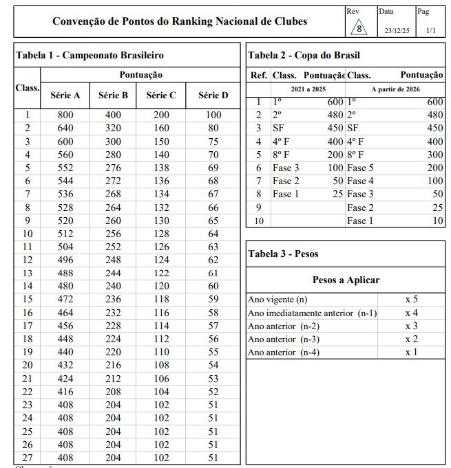 A CBF também divulgou a convenção de pontos do RNC. Para cada um dos cinco anos do período considerado, do mais recente ao mais distante, são atribuídos pesos, a serem convertidos sobre cada pontuação. Veja na imagem a seguir.