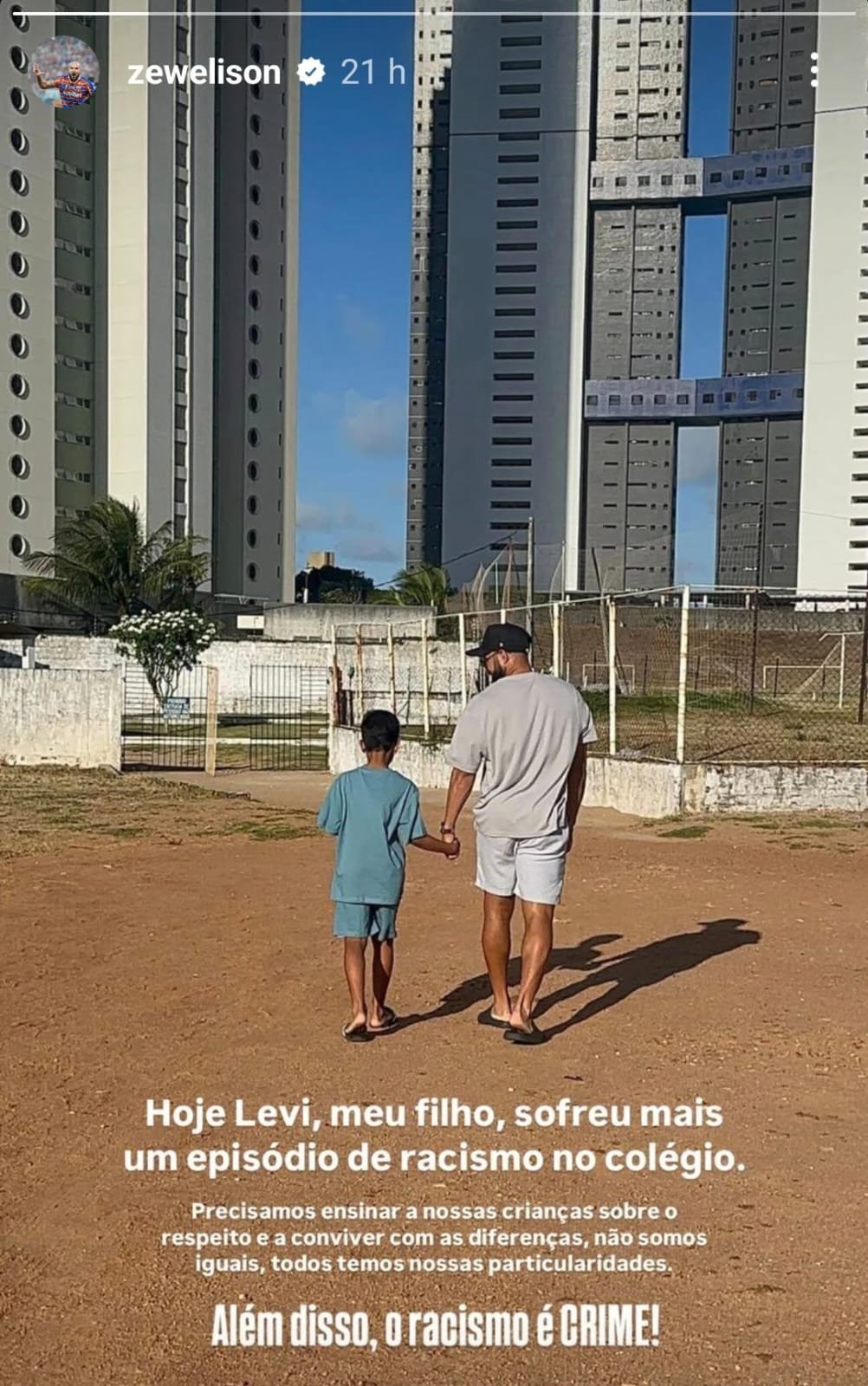 “Hoje Levi, meu filho, sofreu mais um episódio de racismo no colégio. Precisamos ensinar a nossas crianças sobre o respeito e a conviver com as diferenças. Não somos iguais, todos temos nossas particularidades. Além disso, o racismo é crime”, escreveu.