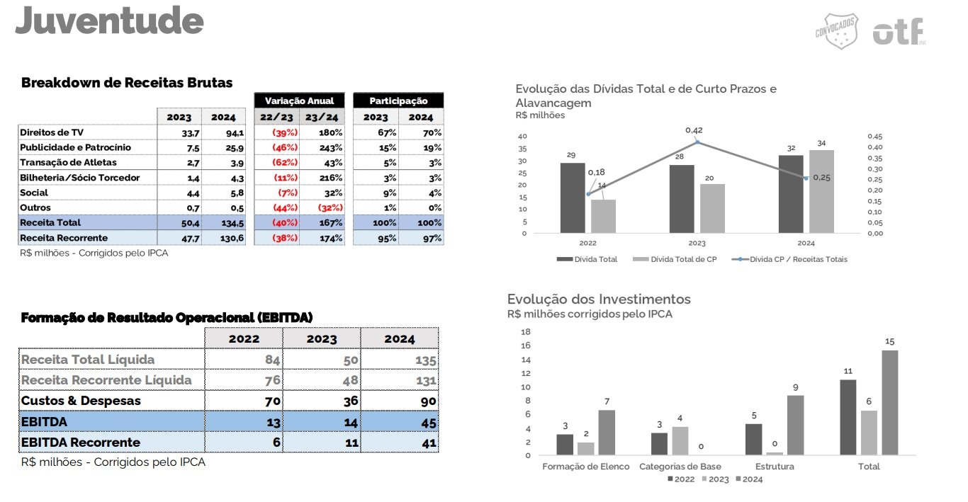 Na última temporada, o Juventude teve receita total líquida de R$ 135 milhões, com despesas e custos de R$ 90 milhões. O Ebitda (lucros antes de juros, impostos, depreciação e amortização) foi de R$ 45 milhões.