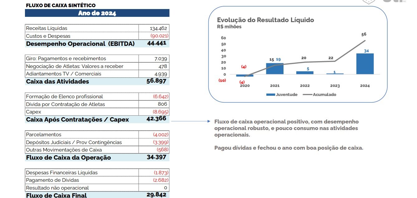 Segundo o relatório, a receita do Juventude para melhorar a situação financeira foi “fluxo de caixa operacional positivo, com desempenho operacional robusto, e pouco consumo nas atividades operacionais”.