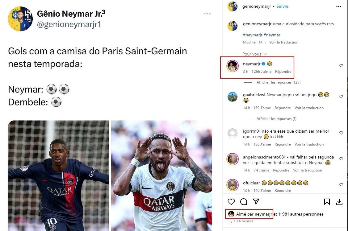 O atacante Neymar zombou dos números de Ousmane Dembelé, camisa 10 do Paris Saint-Germain, da França. O craque brasileiro reagiu com um emoji de gargalhada a uma postagem do perfil “Gênio Neymar Jr” no Instagram.