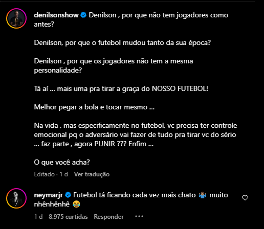 “Futebol está ficando cada vez mais chato. Muito nhênhênhê (emoji de risada)”, escreveu nas redes sociais em resposta à uma publicação do ex-jogador e comentarista Denílson.