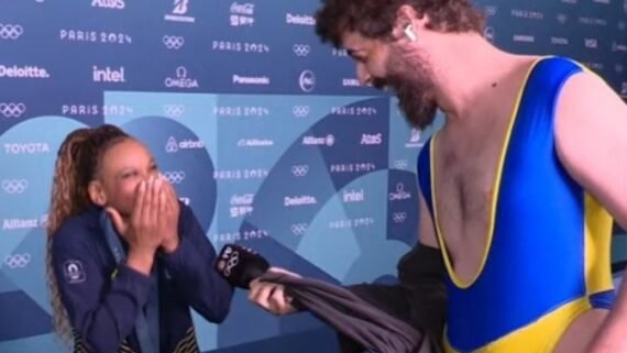 Uma cena inusitada aconteceu após a conquista do ouro de Rebeca Andrade na final do solo nos Jogos Olímpicos de Paris 2024. O humorista Diogo Defante, que cobre o evento pela CazéTV, fez uma pergunta sobre os collants usados pela ginasta. Porém, surpreendeu ao exibir o seu próprio modelo.