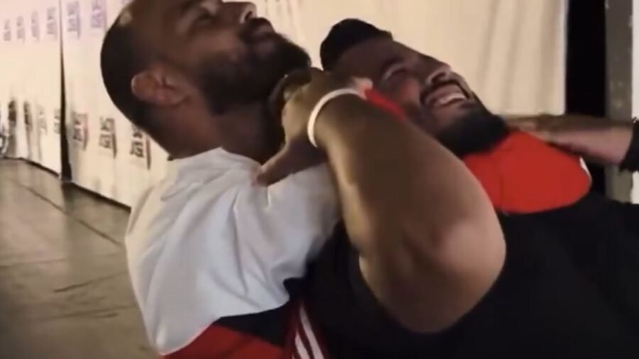 Porém, Jean dá sequência ao golpe e o homem desmaia. Apesar do “susto”, o fã levanta rapidamente, ri e abraça o lutador segundos depois.