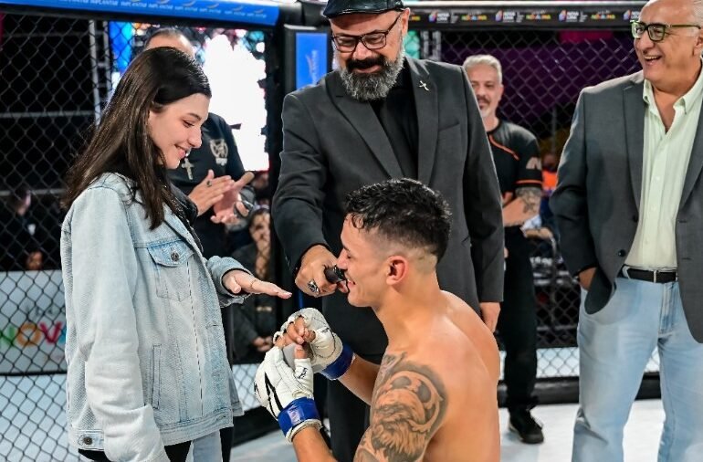 Na sequência, o lutador de 20 anos se ajoelhou no centro do cage, retirou uma aliança do short e fez o pedido de casamento ali mesmo, diante da plateia. Beatriz, emocionada, levou as mãos ao rosto, e antes que conseguisse responder, foi abordada por Sandribas, que usou seu tradicional bordão – o mesmo dos eventos do Jungle Fight transmitidos pela TV Globo – com um toque especial: