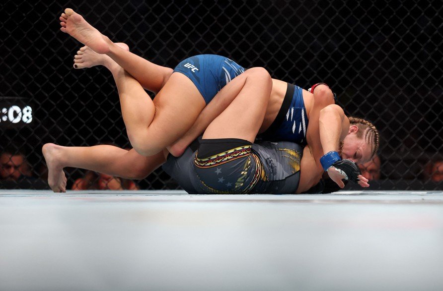 O primeiro round foi marcado pela estratégia da judoca. Kayla, com paciência, esperou o momento certo para encurtar a distância e levar a luta para sua zona de conforto.