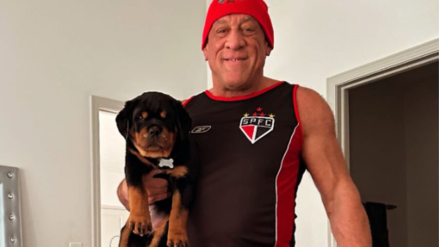“King Martello e e eu já tivemos um ótimo dia. Meus pulmões estão melhores, meus olhos estão bem e a pneumonia desapareceu. Fico mais forte a cada dia”, escreveu o americano de 59 anos, em companhia do novo cão de estimação.
