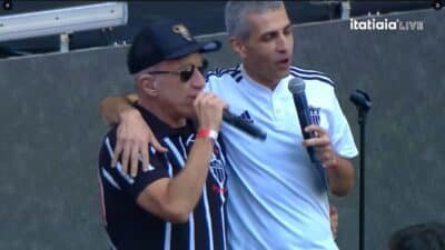 Na transmissão da Rádio Itatiaia, o jornalista aparece abraçando Podé, vocalista do Tianastácia, que cantava o hino do Galo antes de a bola rolar para os ex-atletas.