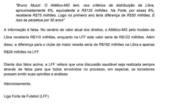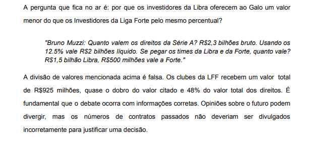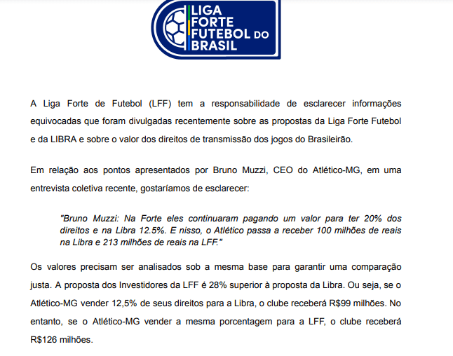 Por fim, a Liga Forte Futebol pontua que “no cenário de valor atual de direitos”, o Atlético receberia R$ 110 milhões pelo modelo da Libra no primeiro ano, contra R$ 122 milhões na LFF. A informação também contradiz fala de Bruno Muzzi durante entrevista.