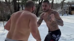 Ao lado de Glover Teixeira, ex-campeão da mesma categoria, Poatan treinou grappling (luta agarrada) no meio da neve. O frio, inclusive, não pareceu ser um problema para a dupla, uma vez que se enfrentaram sem camisa, o que complicou ainda mais a vida de quem sofreu uma queda e ficou com as costas no chão.